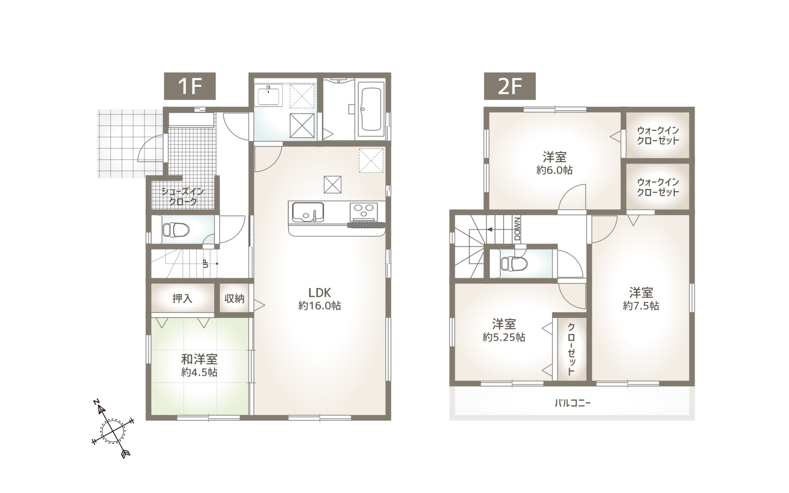 敷地約49坪のゆとりある広さに、4LDK+2つのウォークインクローゼット+シューズクロークの豊富な収納を確保。